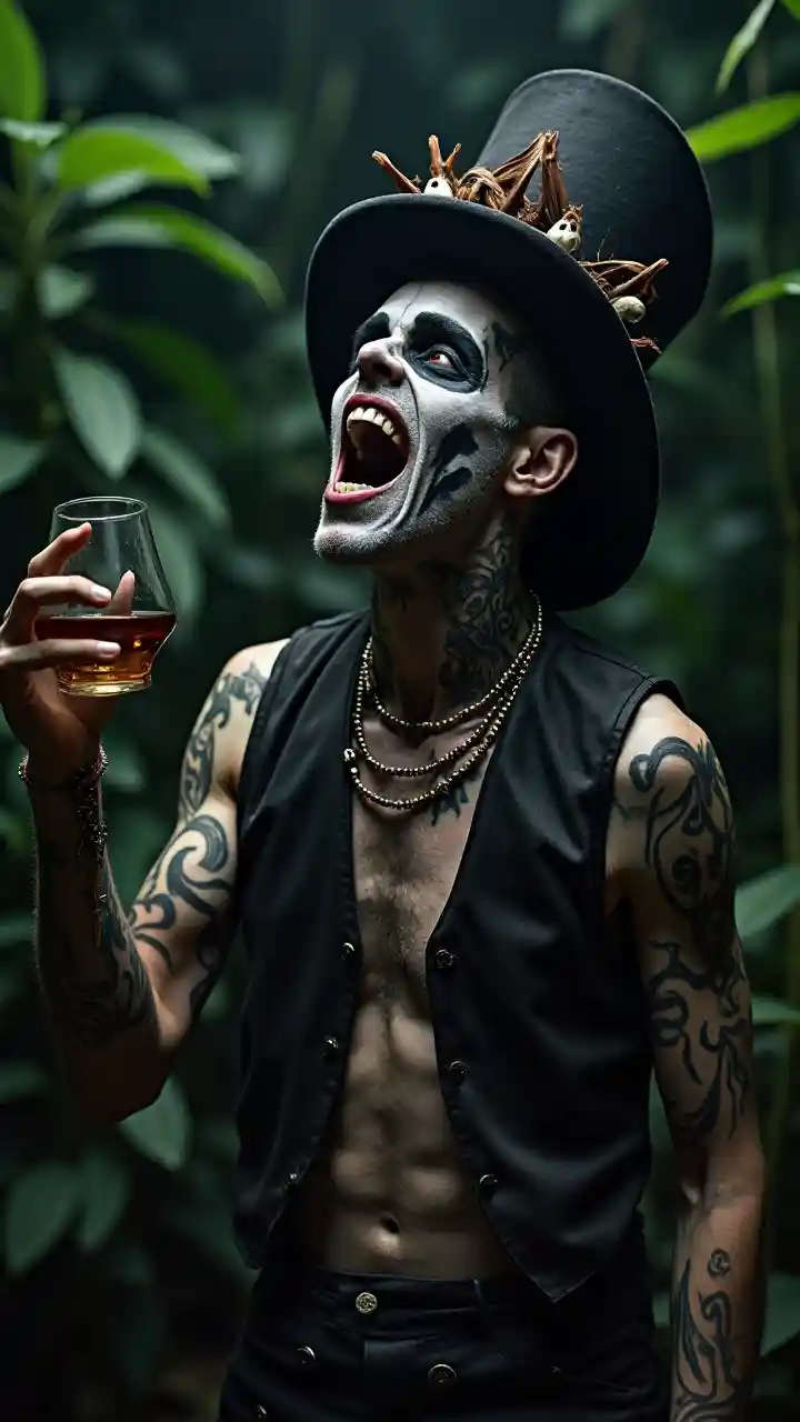 Un prêtre vaudou hurlant, avec de grands yeux ouverts, des expressions folles sur le visage, le maquillage du visage ressemble à un squelette, le maquillage est en partie appliqué à la craie, le chapeau haut de forme noir minable, le bord du chapeau est fait de plumes de poulet et de petits squelettes, gilet noir en cuir minable, son cou, sa poitrine et ses bras sont complètement tatoués de symboles vaudou, un verre de rhum dans la main gauche, un poing dans la main droite vers le ciel, tout le corps, minuit, le fond est une scène de jungle tropicale, profondeur de champ, photos extrêmement