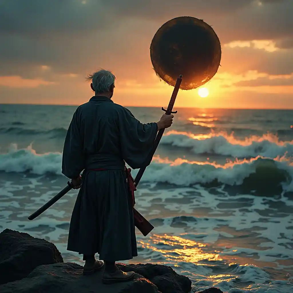 Vue dramatique de la mer au crépuscule: un maître ramen japonais souffrant du vent et du gel se tient au bord de la mer turbulente, dos à la caméra. L'angle de vue est divisé, d'un côté la figure du vieil homme est proéminente, de l'autre l'eau qui coule. Il brandit deux katana en l'air, avec lesquels il dessine un soleil noir à bord d'or profond contre le ciel. Sa main gauche porte une âme tissu impériale, tandis que son épée droite n'a qu'un subtil halo doré foncé autour du contour du soleil noir. L'ambiance générale est mystérieuse et solennelle.