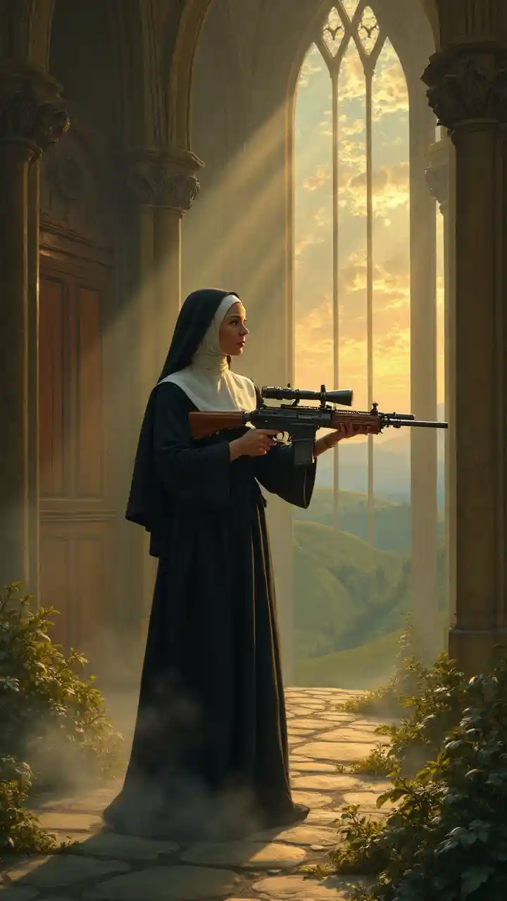 Une religieuse paisible brandissait avec élégance une mitrailleuse surdimensionnée et se tenait fermement dans la grandeur d'une ancienne cathédrale, baignée d'un soleil doré filtré à travers les vitraux. Le paysage extérieur est une tapisserie éthérée, avec des collines d'émeraude ondulantes qui rejoignent l'horizon sous un ciel crépusculaire. La composition, inspirée du mouvement Die Brücke, mêle surréalisme à des éléments oniriques pour exécuter sur place des sorts enchanteurs. La brume plane autour d'elle, comme des murmures fantasmés, insufflant à ce moment un esprit éternel, transcendant.
