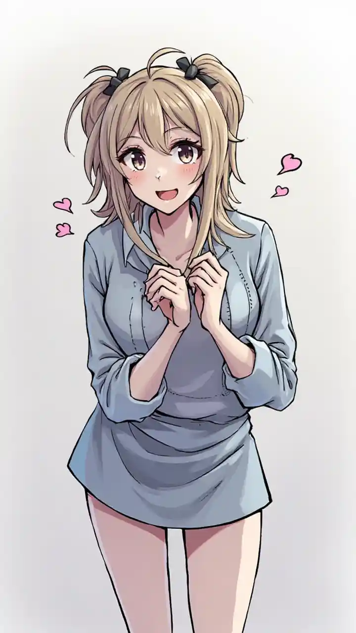 Shaona se penche en avant et se touche la poitrine avec ses mains, montrant un sourire.