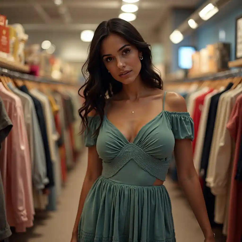 Une femme latine fait ses courses dans un magasin de vêtements