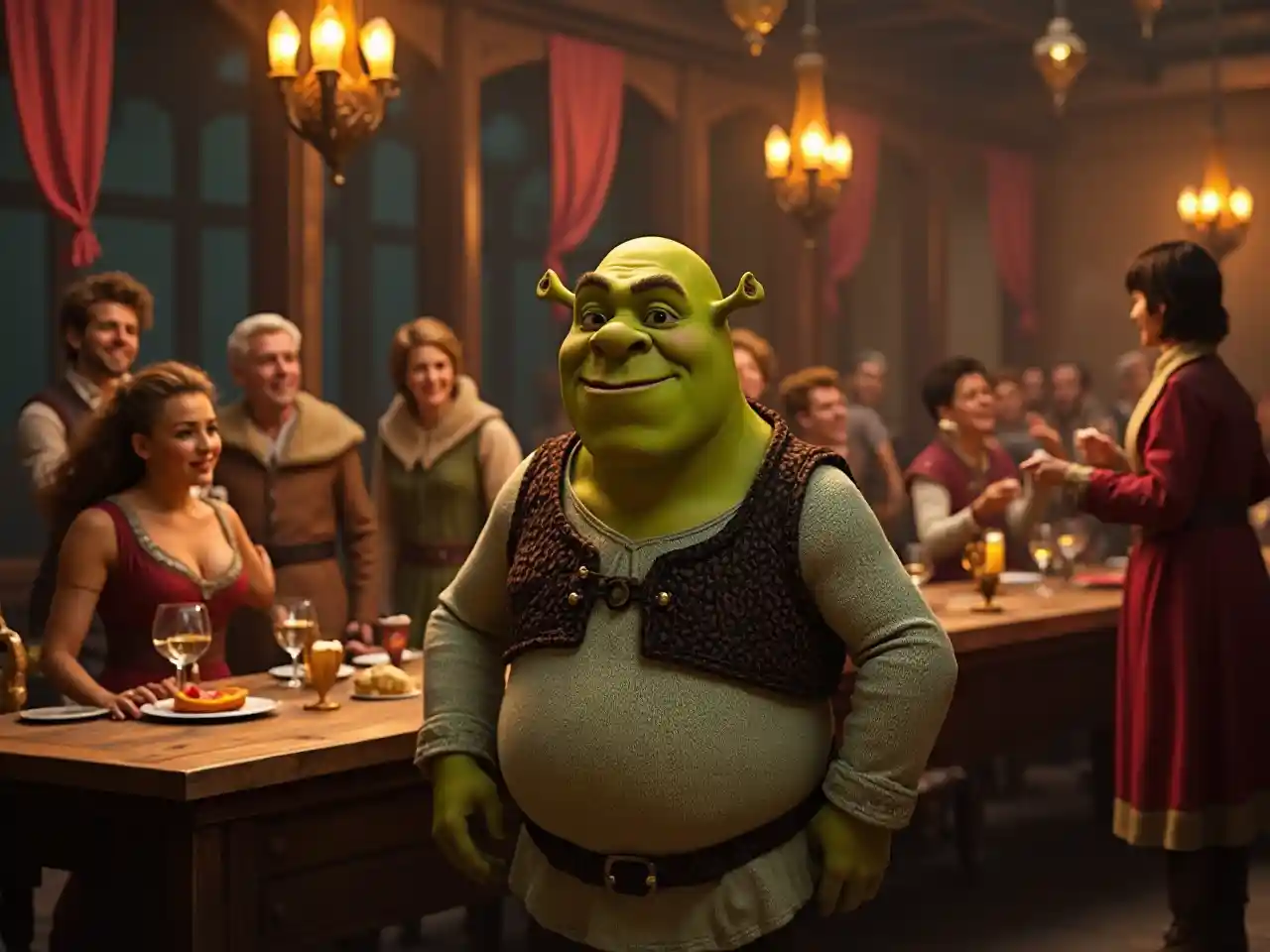 Shrek, un monstre en costume, une atmosphère joyeuse, des décors de fête médiévaux, des banquets luxueux avec des tables en bois, des banderoles colorées et des lustres, des lumières de lanterne créent une lumière chaleureuse, et des costumes médiévaux élégants entourent Shrek, permettant aux invités de profiter de la célébration. Les détails riches et le fond texturé, l'atmosphère fantasque et ludique, les couleurs ultra-détaillées, haute définition et énergiques suscitent un sentiment de joie et de célébration.