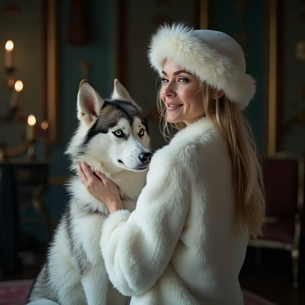 Une beauté blonde aux yeux bleus tourne le dos au spectateur, debout dans une chambre victorienne faiblement éclairée et magnifique, portant un chapeau en fourrure blanche et un manteau de renard polaire en fourrure blanche assorti. Elle porte doucement un husky sibérien sur ses épaules et le regarde avec un sourire chaleureux. Une seule source lumineuse terne
