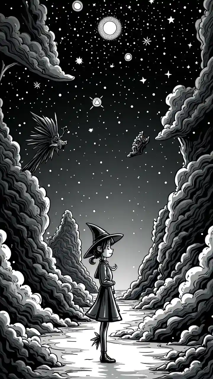 Une affiche de style dessin animé en noir et blanc est générée, rappelant l'ère des films muets, et l'espace profond est plein d'étoiles peintes à la main et animées et de nébuleuses rappelant les premiers films. Dans ce vide éternel, une petite sorcière solitaire, aux traits exagérés et symbolisant le dessin animé rétro, contemple l'environnement d'un air cocasse d'étonnement. Autour d'elle se trouve un portail de style comme les vieilles rayures de zoetrope, planant dans un noir et blanc charmant, chaque écran de cinéma silencieux vers un univers de dessins animés différent et fascinant