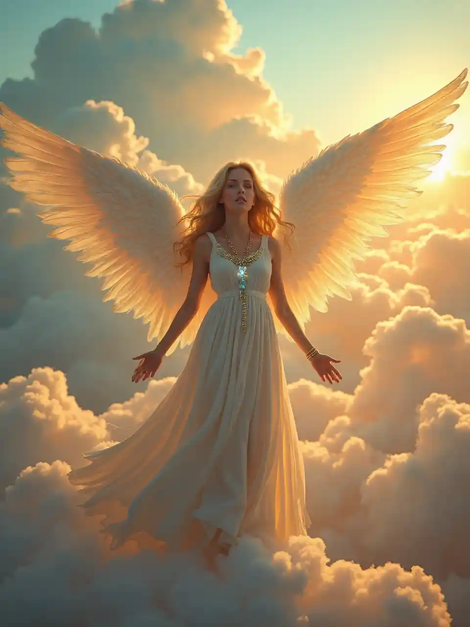 De belles anges féminines, chantées aux grandes ailes, sur les nuages du matin au lever du soleil. Ses cheveux sont dorés, ses yeux bleus cristallins et ses bijoux brillent au soleil
