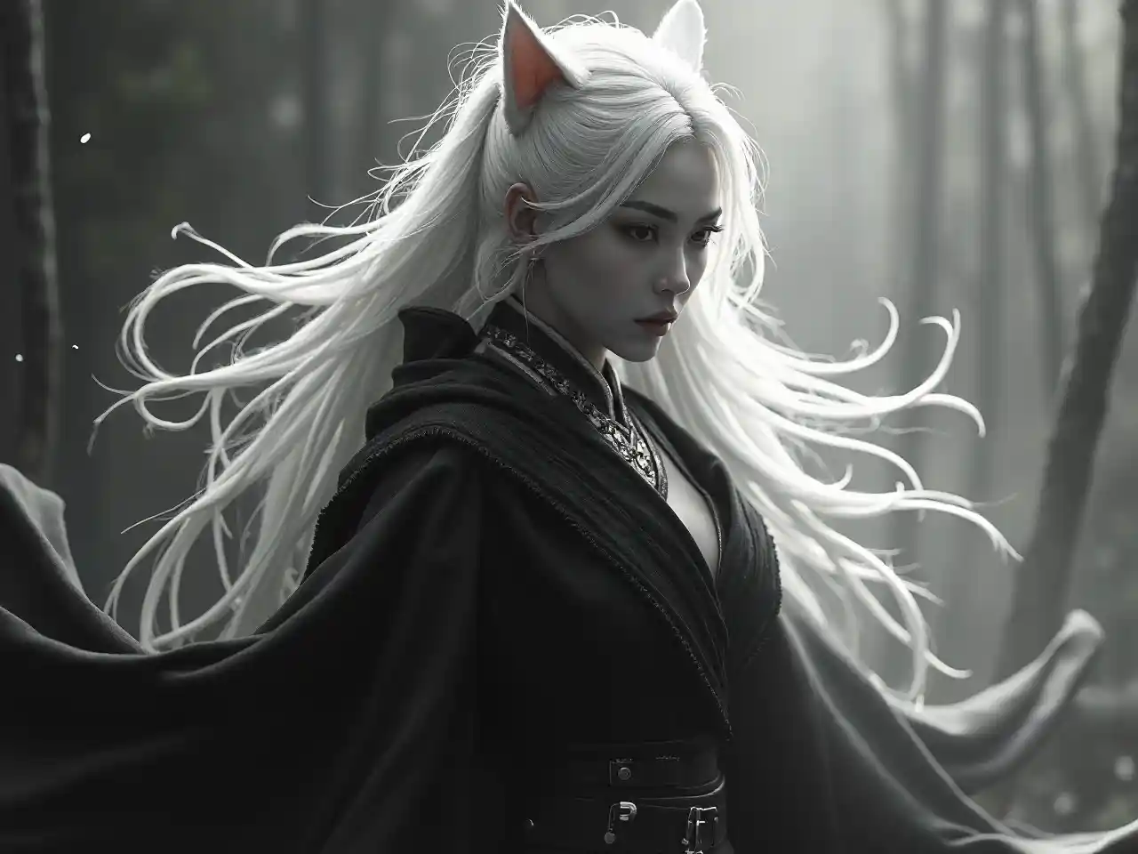 La seigneurie asiatique, aux cheveux blancs accrocheurs et aux oreilles de chat, est capturée dans un chef-d'oeuvre 8k ultra-détaillé. Elle prend des postures dynamiques, plongée dans un fond complexe, profond et riche. La scène est représentée en niveaux de gris monochromes, ce qui améliore la profondeur globale de l'atmosphère. La mise en valeur créative consiste en une brume éthérée qui plane autour d'elle, soulignant sa présence sciste. La composition évite les facteurs négatifs, met l'accent sur la maîtrise de l'art et accorde une attention particulière à l'anatomie réaliste et aux détails visuellement accrocheurs, assurant une expérience visuelle fascinante et immersive.