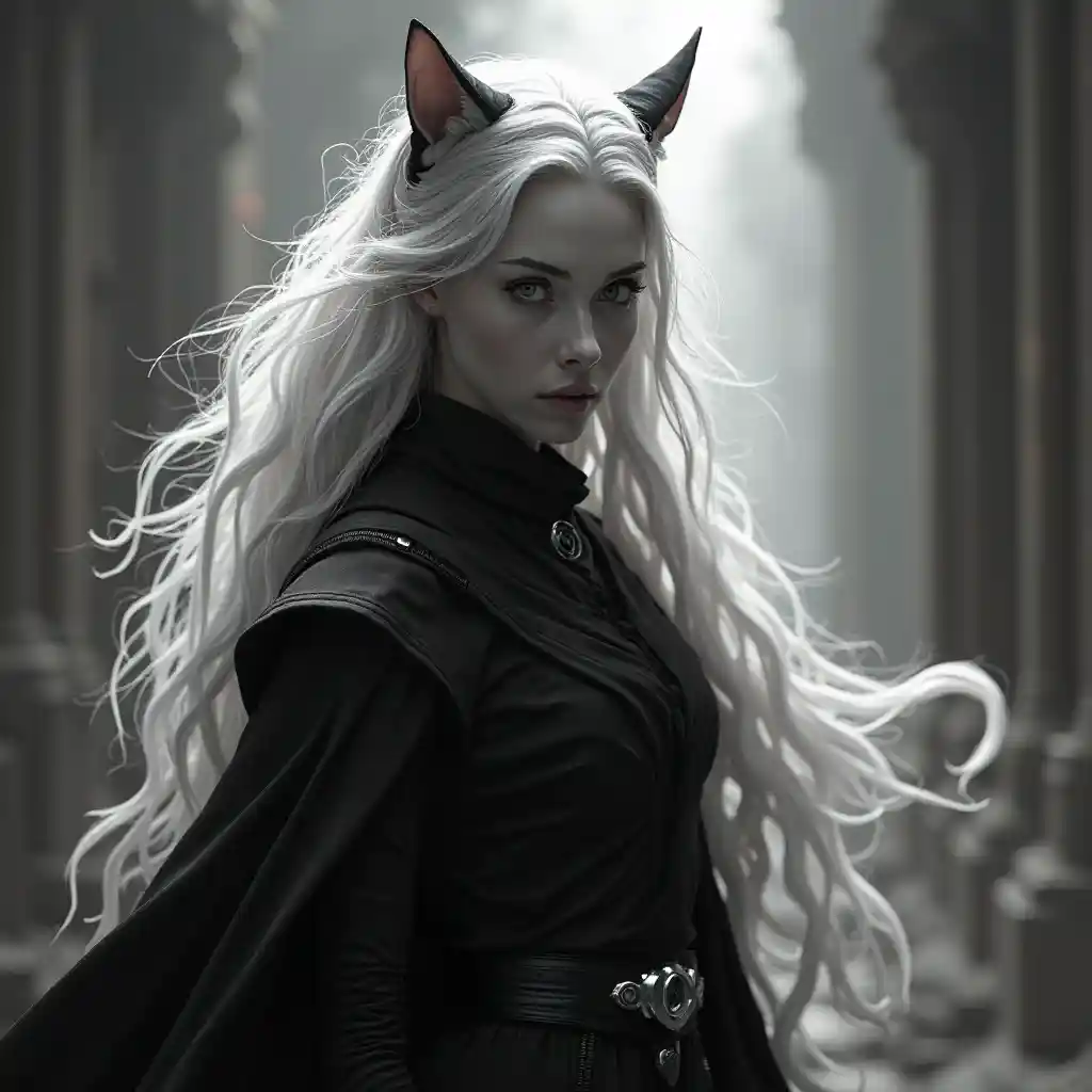 Une charmante seigneurie Sith de l'univers STAR WARS se tient dans une posture dynamique, ses cheveux blancs fluides et ses oreilles de chat accrocheuses soulignent sa beauté envoûtante. Son visage, beau et ultra-détaillé, montre un chef-d'oeuvre des traits méticuleux. La scénographie est rendue dans une qualité 8k époustouflante, avec un fond immersif qui l'enveloppe dans une atmosphère de mystère et de puissance. La profondeur de champ améliore la palette monochromatique en niveaux de gris, créant un contraste dramatique, soulignant sa présence majestueuse. Elle mêle de subtiles subtilités créatives pour incarner l'essence de la force et de l'élégance dans des galaxies lointaines et lointaines.