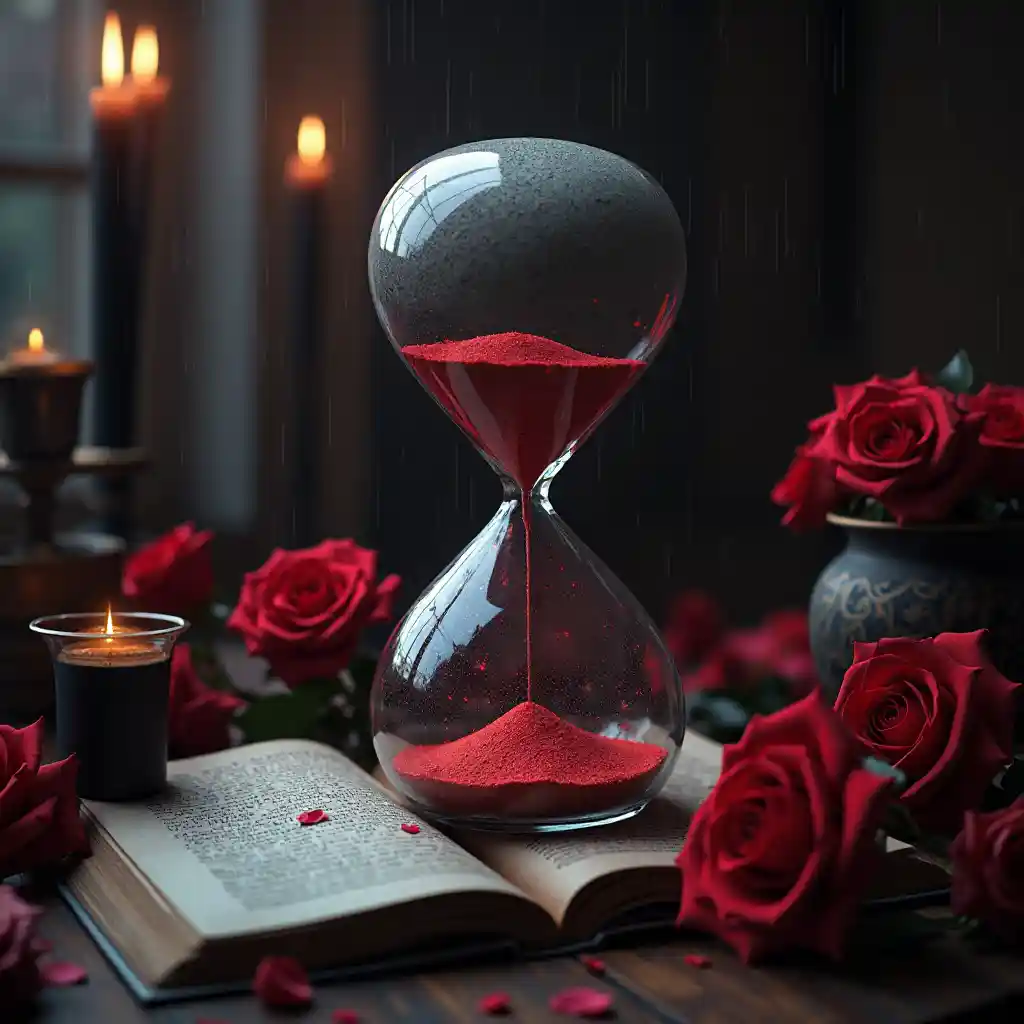 Un crâne et un sablier (Sanduhr), à l 'intérieur du crâne et du sable, avec très peu de sable, des bougies noires et rouges dans la chambre, des roses noires et rouges sur la table, des livres ouverts à côté du sablier, ultra-détaillés, ultra-réalistes, focaux tranchants, infrarouges, fortes pluies, art numérique. Une ambiance dramatique méticuleusement méticuleusement dramatique minimaliste digita mémorable, impressionnante, époustouflante de beauté, de lumière volumétrique, de halo, de rayons, de couleurs vives reflétées par jules verne