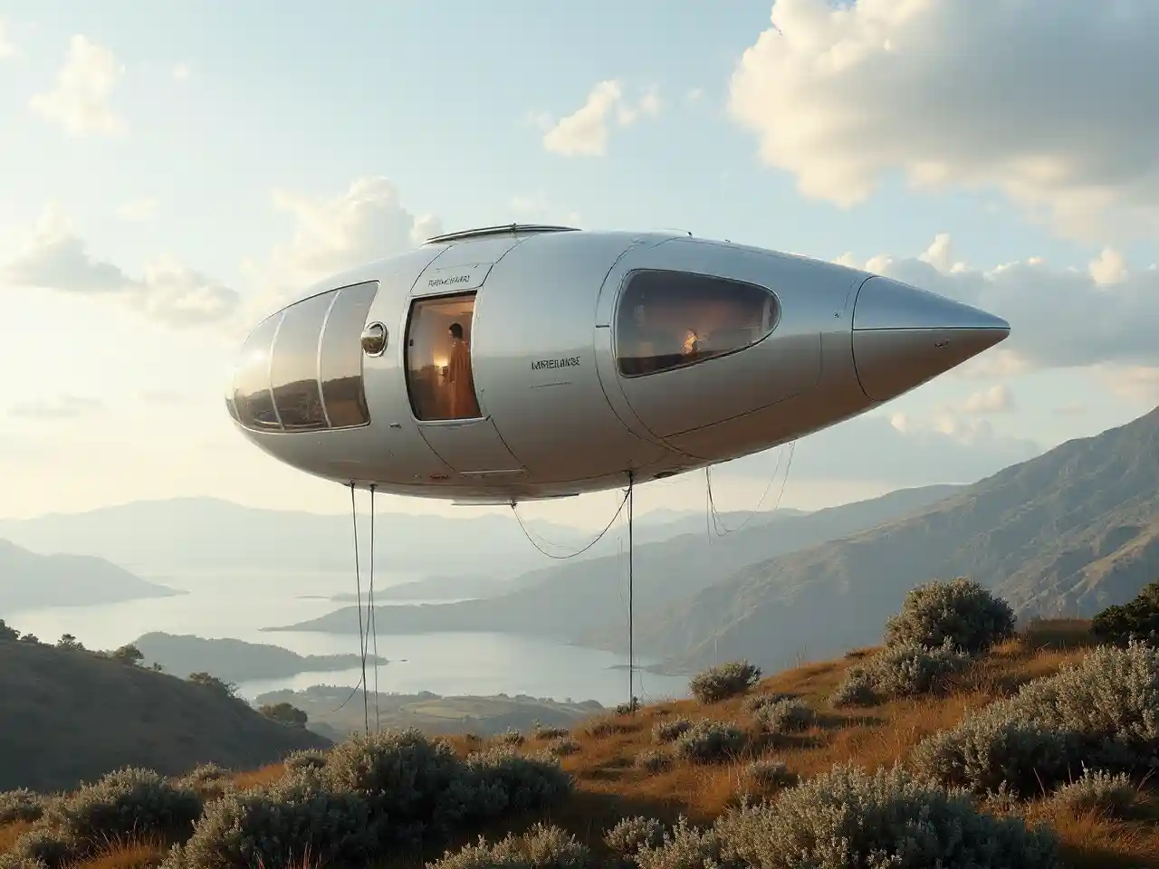 SamuelLa capsule Skyrim flotte élégamment au-dessus de la terre, attachée au sol par des ancres invisibles, et son design élégant et futuriste jette une ombre douce sur le paysage en dessous.