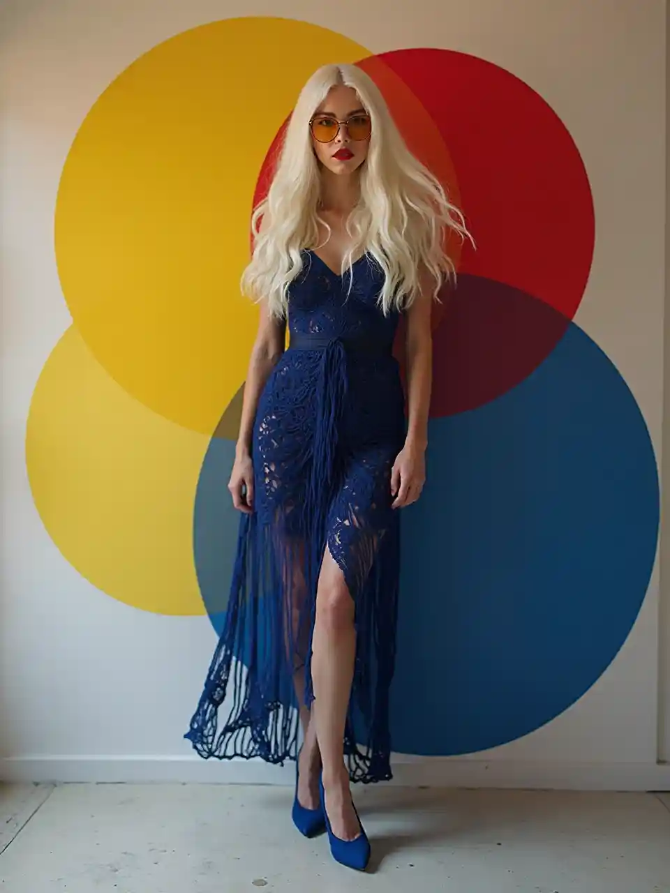 Une atmosphère élégante et mystérieuse, une femme slave confiante mais au regard détaché, femme fatale d'une vingtaine d'années. Elle a des lèvres rouge vif, des cheveux blancs et lisses extrêmement longs et brillants, et ses cheveux flottent sous le vent fort. Elle est longiligne et sportive et musculaire. Elle porte des verres jaunes, avec des lunettes rouges à grand monture. Elle porte une belle robe à crochets bleu marine et des escarpins bleu marine. Elle fait face à son public dans une posture de modèle élégante et affirmée. À l'arrière-plan, un grand mur de studio de couleurs unies est peint avec trois cercles qui se chevauchent, de couleur rouge, jaune et bleu. Ce sont les couleurs primaires du modèle à réduction de couleur.