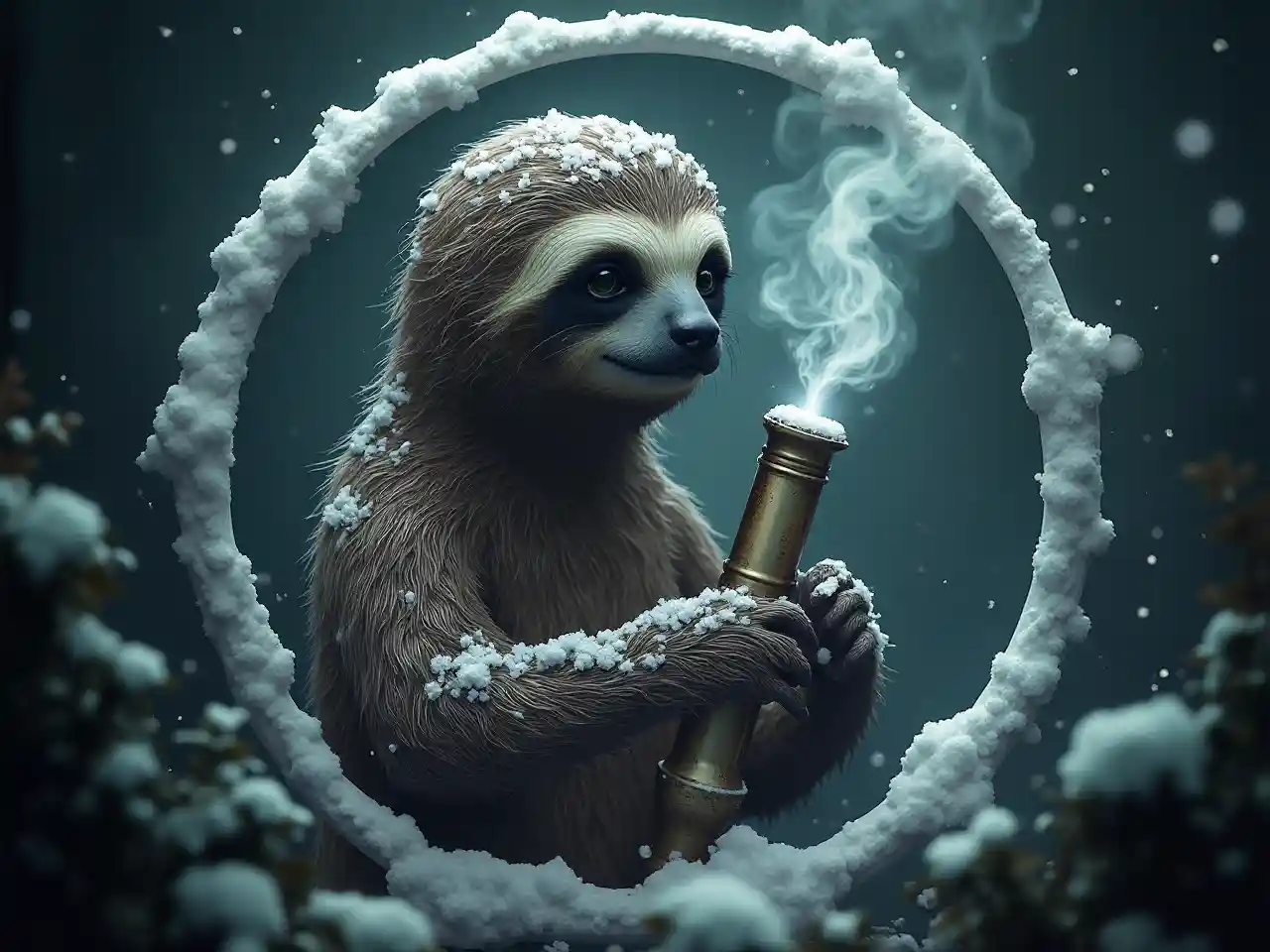 Stoner paresseux → Rendez celui-ci plus sombre et plus avant-gardiste. Il n'y a qu'un seul paresseux qui fume un pistolet cigarette dans un cadre rond. → Pouvez-vous le laisser neiger et rendre l'image un peu plus lumineuse?