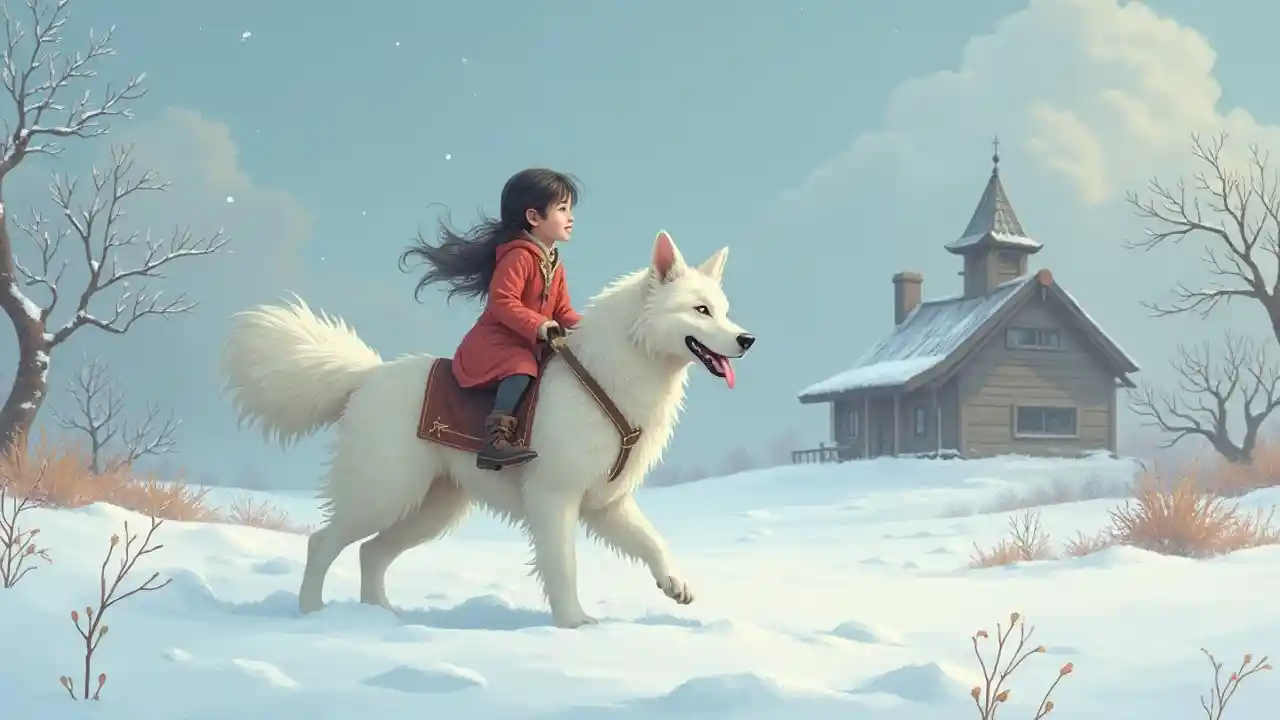 Une fille sur le dos d'un grand chien blanc dans la neige, une maison en arrière-plan, Cui Bai, Nouveau romantisme, Ghibli, une photo d'inventaire