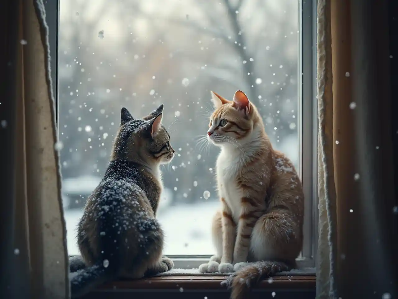 OliviaLe chat s'assoit à la fenêtre, regarde la neige tomber, vue d'hiver, mignonne, nostalgique