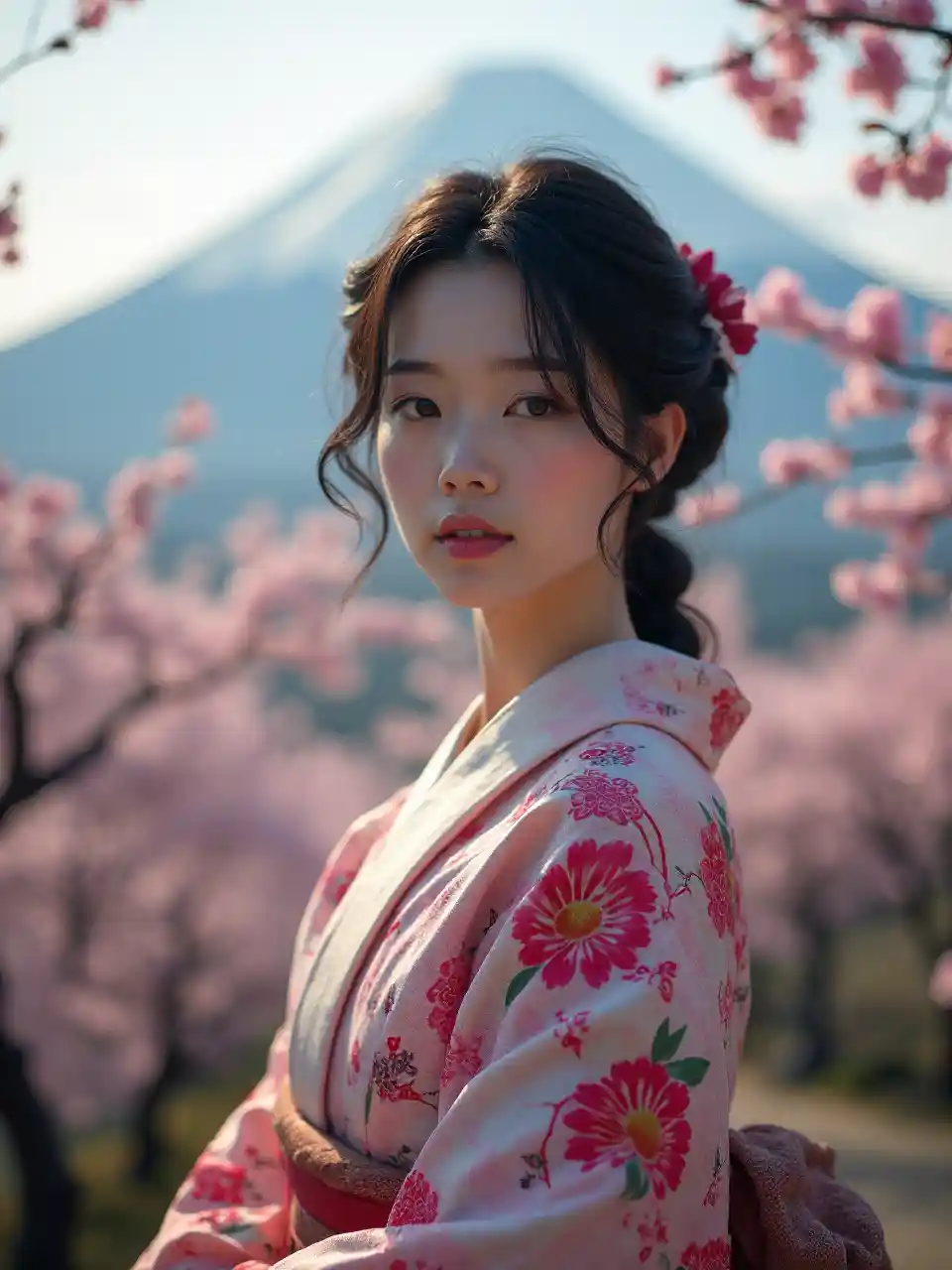 La douce mise au point capte le portrait serein d'une femme vêtue d'un kimono traditionnel japonais, debout sur le fond majestueux des montagnes Fuji. Les fleurs de cerisier fleurissent délicatement derrière elle, avec des teintes roses qui forment un subtil contraste avec ses cheveux noirs. Son regard, posé et contemplatif, croise celui du spectateur, comme s'il partageait un moment de réflexion tranquille., Robe de kimono, berlliana