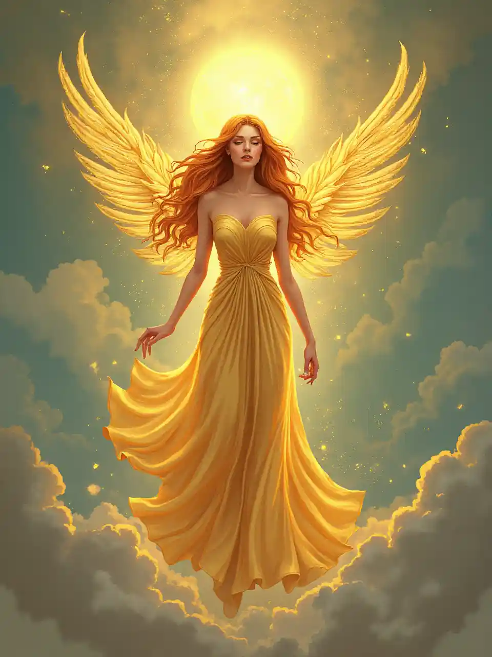 "L'âme d'une femme" est une illustration du corps entier capturant l'essence de l'âme d'une femme, enveloppée d'une lumière douce et éthérée. La dame a de longs cheveux soyeux jaune gingembre. L'âme émerge de son costume doré dans une tendresse ascendante, soulignant sa beauté céleste. La structure complexe aux ailes traduit la présence majestueuse de l'âme, harmonieusement intégrée à l'atmosphère éthérée. Ce récit visuel, qui met l'accent sur le lien entre la matière et l'esprit, invite le spectateur à réfléchir à la nature fascinante de l'âme.