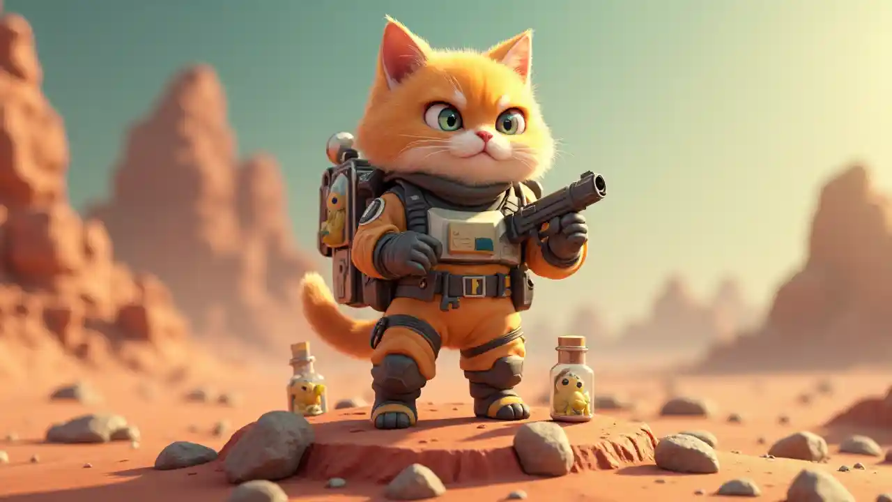 Rendement 3D d'un drôle et mignon chat pliant écossais façon Clash of Clans, armé d'un pistolet de capture fantôme. Vêtu d'une combinaison spatiale futuriste avec un jet sac à dos. Fièrement debout sur un monstre mort et un extraterrestre dans une bouteille capturée. Regard digne mais un peu énervé. Ajouter quelques pierres martiennes éparses autour. Elégamment flottant sous zéro gravité sur un morceau de Mars découpé. Studio de fond de couleur pastel, photos réalistes, style Pixar