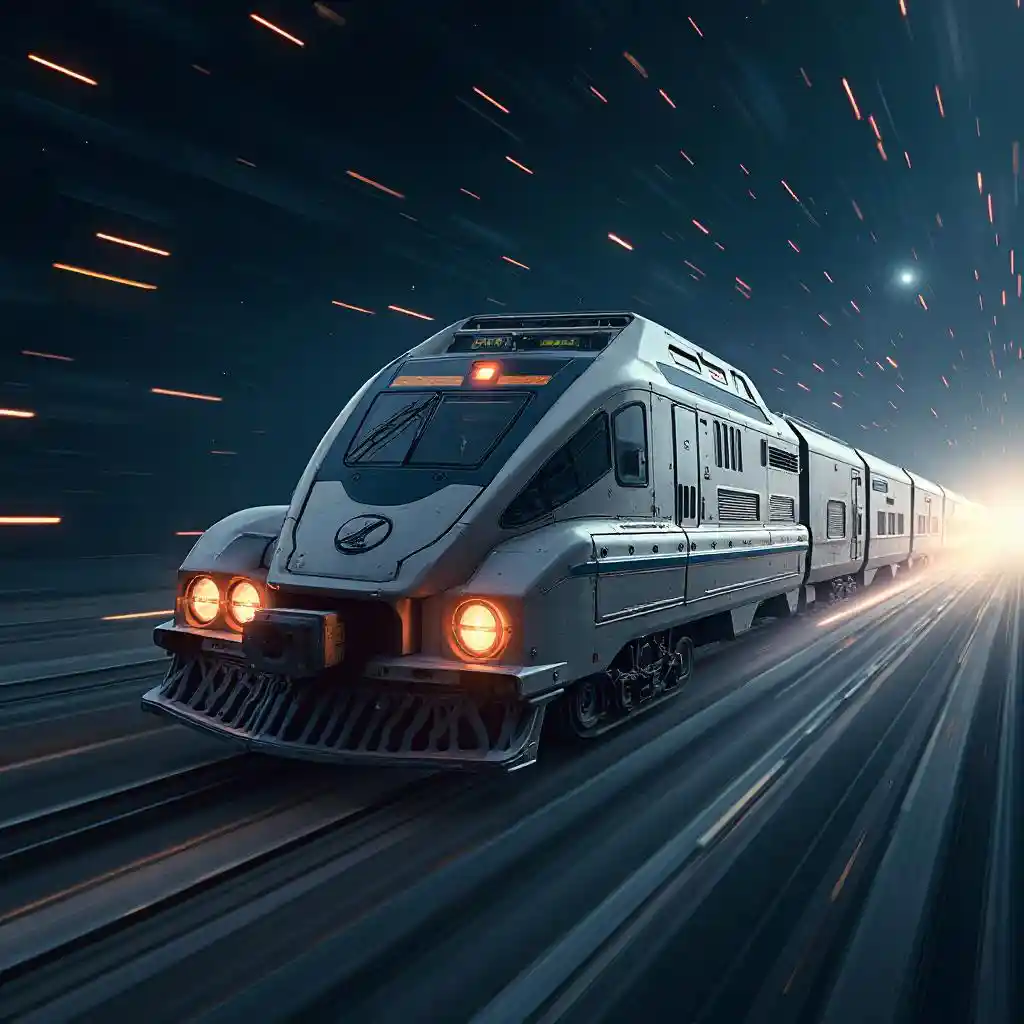 Un train du futur roule à vive allure dans l'espace, entouré d'étoiles.