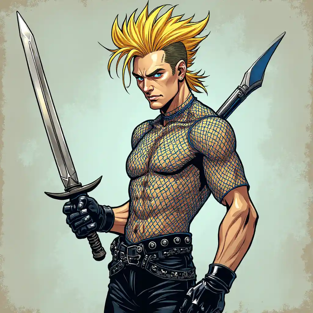 Spindel est un punk, mais il a du talent et du style. Il est armé d'une épée d'argent fantaisiste, capable de percer des trous dans ses cibles. Il est grand, léger, musclé et mince, mais il est très adroit et a des capacités de réflexion éclairantes. Mâle de type blanc, blond blond, vêtu d'un acre mohawk pointu, mince sur le côté et plus long sur le dessus. Il a plusieurs bandes bleu vif devant sa coiffure. Il a les yeux bleus brillants et un sourire souvent fou sur le visage. Il portait une chemise en filet de pêche bleu pur et un jean en cuir noir, une ceinture à double enveloppe avec des rivets lâches autour de la taille et des bottes en cuir noir pointu. Il apporte parfois un peu d'eye-liner et de maquillage pour les yeux, dans le style punk rock bien sûr. C'est un mercenaire, mais qui ressemble plus à une rock star qu'à un super vilain.