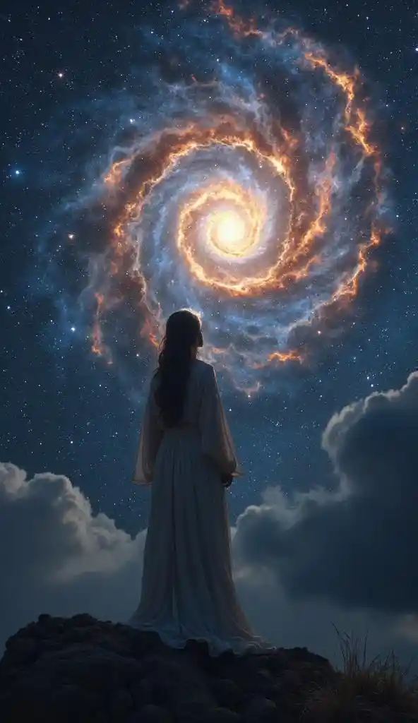 Une déesse (sa position est au bas de l'image), elle ouvre la bouche pour lancer une nébuleuse stellaire qui crée une galaxie spirale (galaxie spirale m
