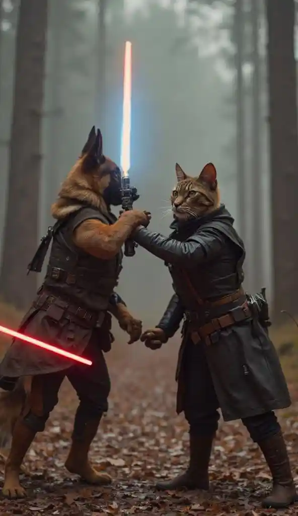 Scène de combat 4K pour chien et chat utilisant un sabre laser