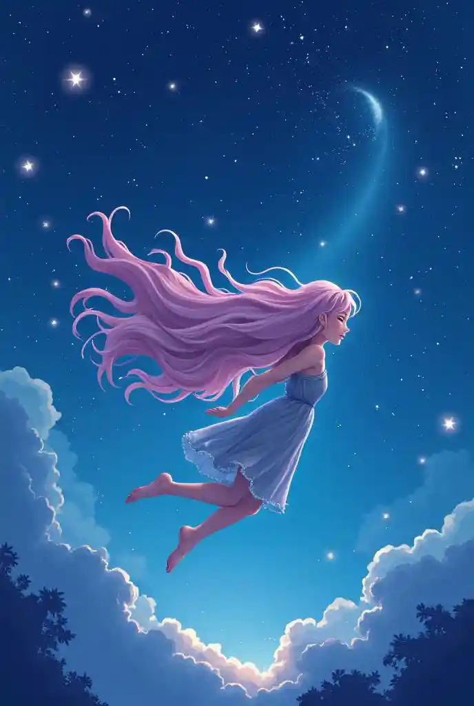 AdelineStyle de livre d'images, livre de contes de fées, Illustration d'art vectoriel créatif: (espace négatif: 1,4), 1 fille, cheveux rose clair et lavande flottant, nuit, ciel étoilé, étoiles shi