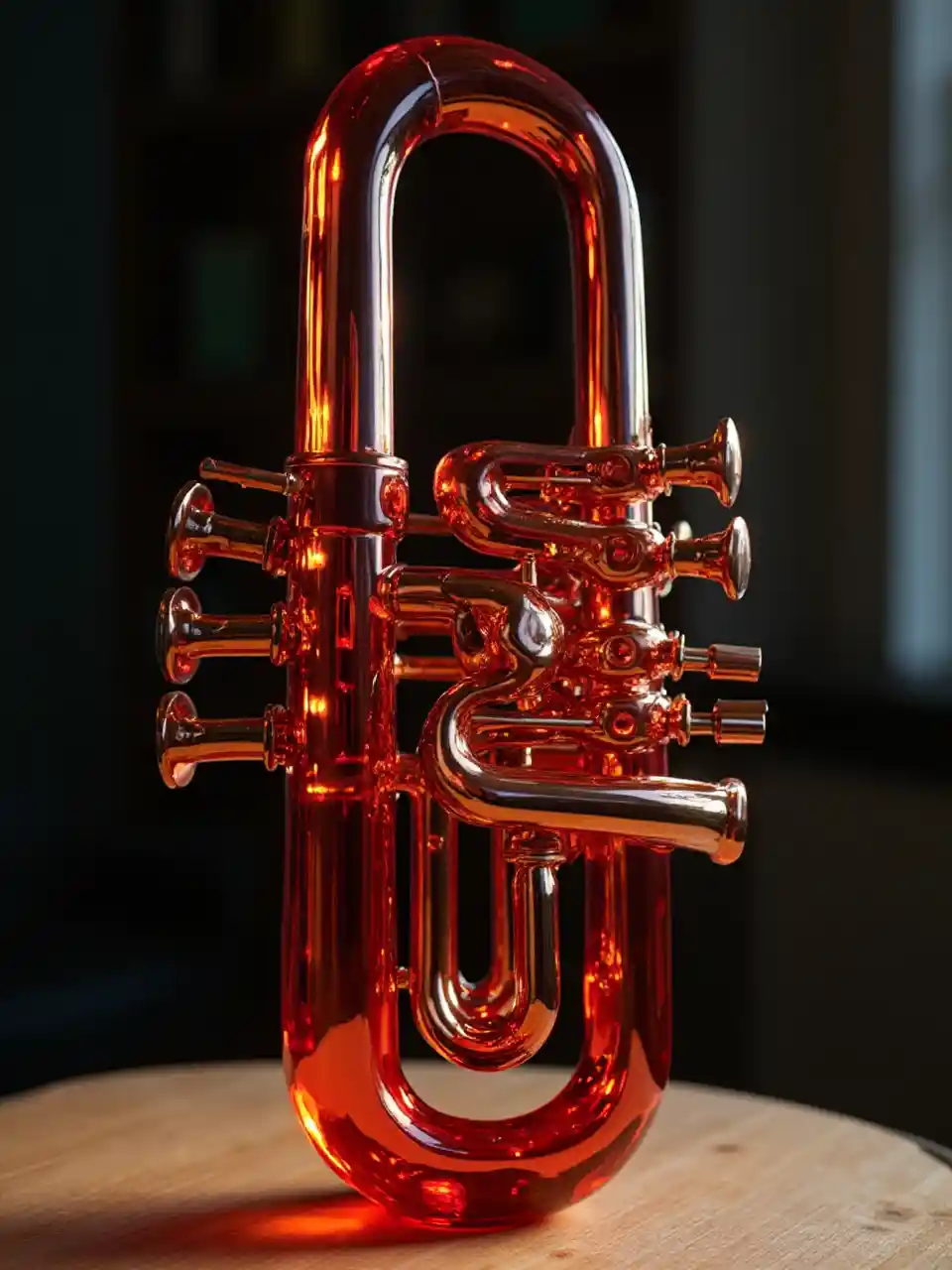 Une sculpture trompette en verre steampunk à piston en cuivre