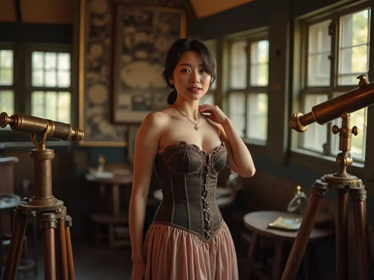 Une femme de 35 ans, d'origine asiatique, pose à l'observatoire Steampunk, en corset et jupe fluide, rayonnante. Le télescope en laiton et la carte des étoiles dessinent sa silhouette, dégageant un charme intellectuel, rétro.