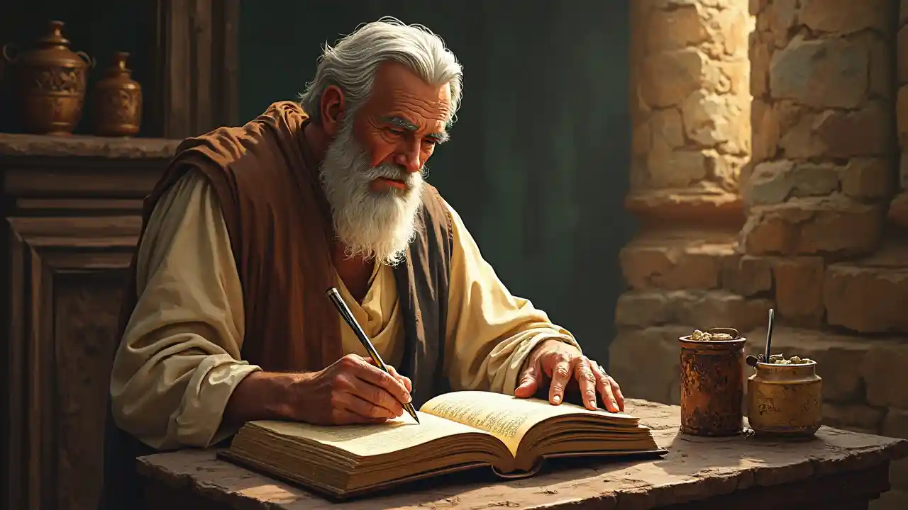DavidConcevoir un avatar pour un compte TikTok appelé « Story _ Telerz. » L'image contient un vieil homme qui écrit une histoire dans un livre sur des thèmes anciens égyptiens ou grecs