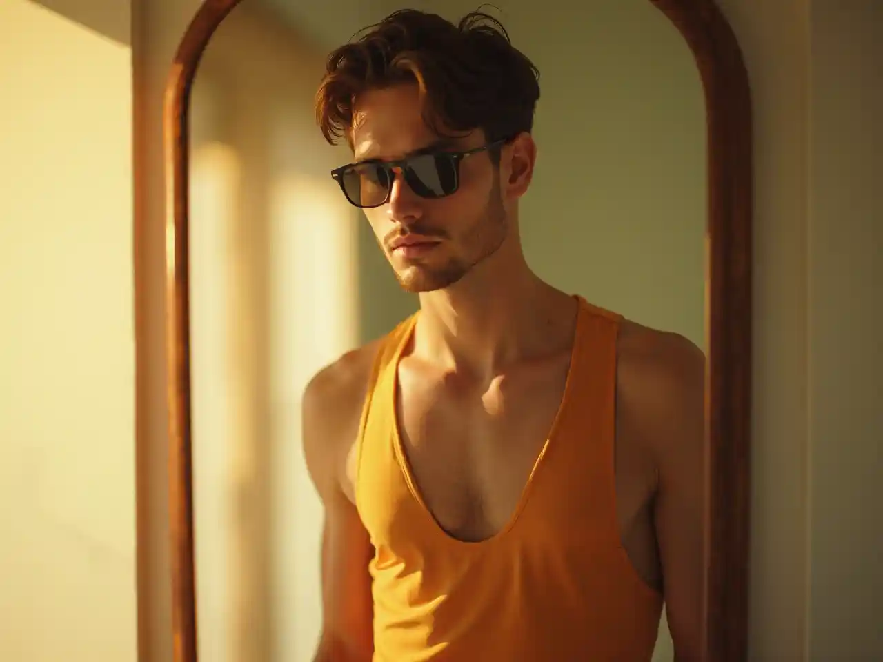 L'image ultra-réaliste d'un bel homme en tenue de plage élégante et lunettes noires élégantes, captée dans un miroir via l'iPhone 14. L'homme, cheveux foncés et courts, se tenait dans une pièce confortable et éclairée. La scène a été filmée dans un subtil grain de pellicule qui rappelle le Kodak Portra 800, avec une ouverture f1.8 pour une heure de grande écoute enchantée. La composition de la photo met en valeur l'aura naturelle, et les lumières douces et chaudes projettent des ombres douces et renforcent l'atmosphère séduisante.