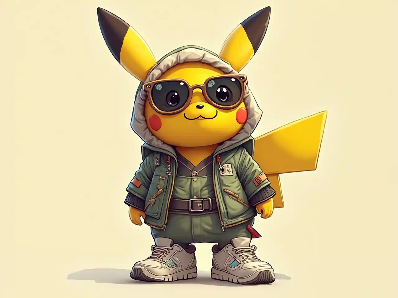 Mignon Pikachu à la mode, nez de canard comme Donald Duck, vêtu d'un survêtement futuriste à la mode, de grosses baskets et de lunettes futuristes