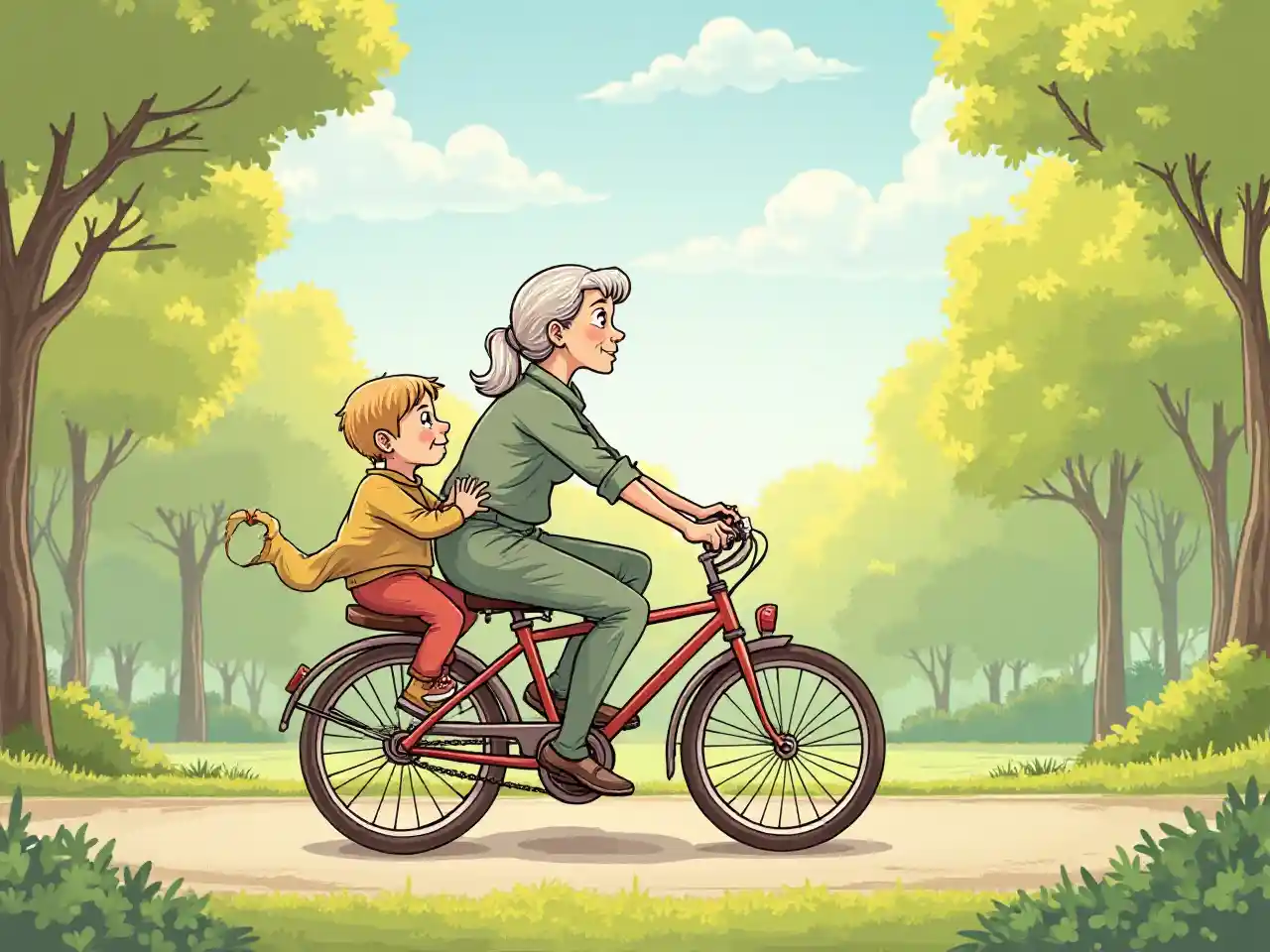 JaydenIllustré par une vieille dame et un bébé à vélo en tandem à Sunshine Park