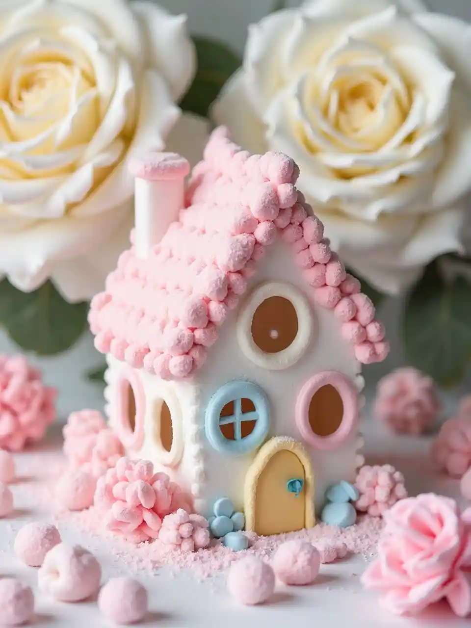 Créez une belle petite maison en guimauve. Couleurs: rose, rose, blanc, jaune, bleu. En arrière-plan, des roses géantes blanches ajoutent une touche de magie et de confort.