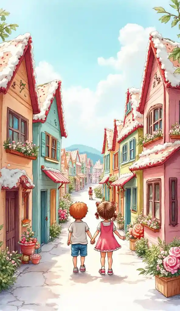 Des aquarelles manuscrites, des maisons en bonbons bordées de paysages urbains, des garçons et des filles se promènent joyeusement dans la ville main dans la main, Les maisons de bonbons sont colorées et colorées