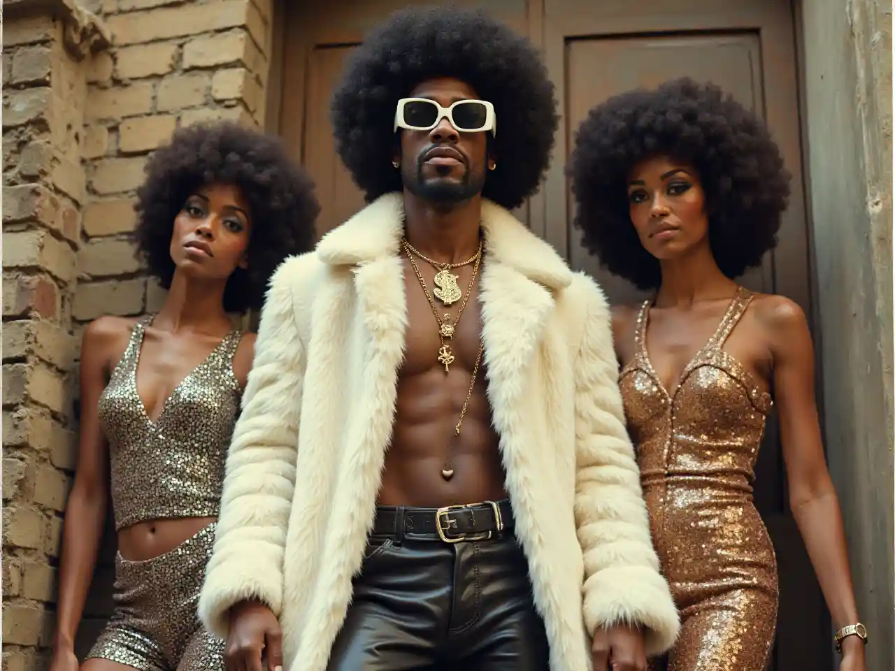 Une pochette d'album de funk des années 70 minable, un chanteur de funk noir mince et sérieux des années 70, un manteau de fourrure blanche, un grand africain, de grandes lunettes de soleil blanches, une chaîne en or avec un pendentif symbole de dollar en or, un pantalon en cuir, debout devant le mur de briques d'une ruelle délabrée, une grande femme vêtue d'une robe scintillante, avec des yeux noirs gonflés des deux côtés, le nom de l'artiste est SWEETBACK WILLIE, Titre de l'album: NATCH DADDY