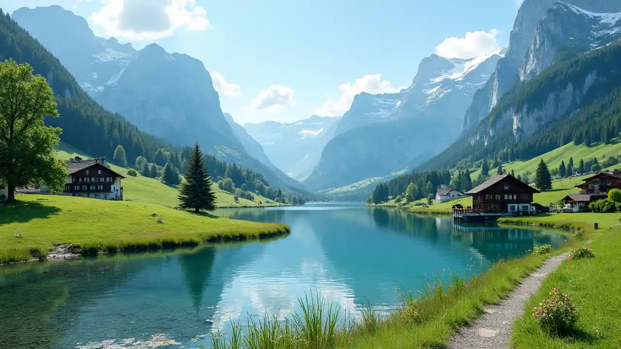 AuroraDes lacs clairs, des montagnes enneigées, des prunes vertes et des maisons en bois charmantes sous un ciel bleu lumineux, une vue paisible sur la Suisse