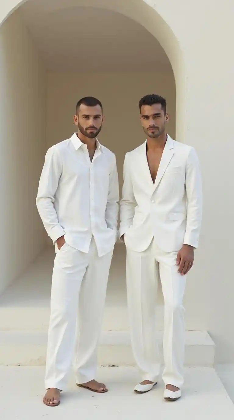 Le modèle de mode masculin blanc élégant porte la mode classique Tansuneh, mettant en place un espace architectural élégant et minimaliste, soulignant la simplicité architecturale avec des tons neutres doux et une lumière naturelle, créant un style raffiné et une atmosphère raffinée.