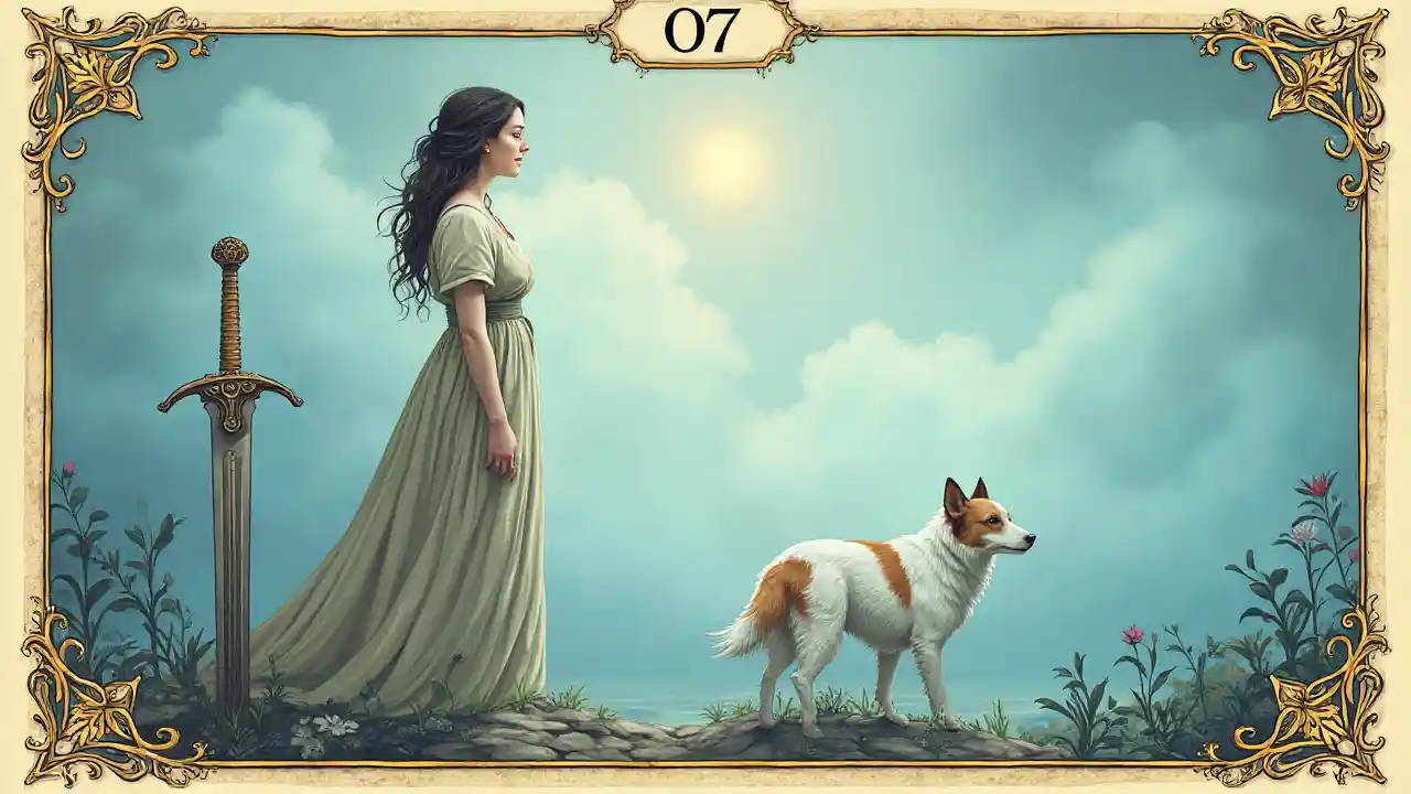 Créez le mystérieux tarot, Sword 07, caractérisé par un individu serein et introspectif, avec un sourire subtil et entendu, vêtu d'une tenue élégante et simple, accompagné d'un fidèle chien de berger frontalier debout à leurs côtés, les deux sont mis en valeur dans un fond bleu doux et progressif, suscitant un sentiment de sagesse et de clarté. Dans le coin inférieur gauche, une seule épée au design compliqué et aux poignées d'épée magnifiques repose tranquillement, symbolisant la reconnaissance et le thème réfléchi de TheCard. La carte est dessinée par un cadre magnifique et incurvé d'un filigrane subtil et doré, parsemé de vignes et de feuilles délicates et entrelacées, ajoutant une atmosphère de mysticisme et de sagesse ancienne. L'esthétique globale est rêveuse, éthérée et contemplative, saisissant l'essence de la citation: « Il devrait y avoir trois gardiens sur le bout de la langue. Est-ce vrai? Est-ce nécessaire? De bonnes intentions? ", Sans se caractériser par le texte lui-même.