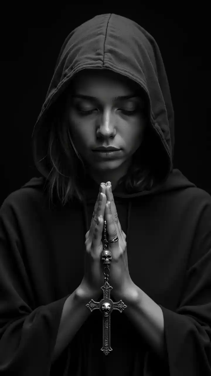 Une image en niveaux de gris montre une femme en larmes, priant les yeux fermés. Elle portait une cape à capuche couverte sur la tête et les épaules. Ses mains jointes pressées devant elle, elle tient à la main un chapelet de croix en forme de squelette. Le fond est tout noir et met l'accent sur la femme et le chapelet