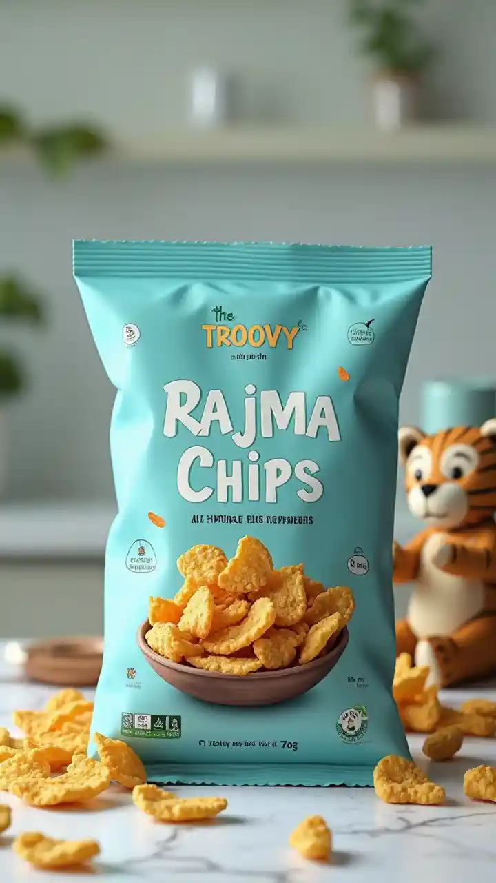 packet discription will be light blue in color comapny name troovy in green with heading of“the health”next line“MUNCHIES”next line in bold“RAJMA CHIPS”next line“All natural ingredents”next line“High Protien”and a small image of“70% less oil”and a logo of teddy tiger holding bowl of chips Et le bas du sac sera "PERIPERI 70g" et le top tight cornor a veg logo Sacs pleins de tranches de soja, cuisine blanche assise avec un tigre en peluche et mange près d'un sac