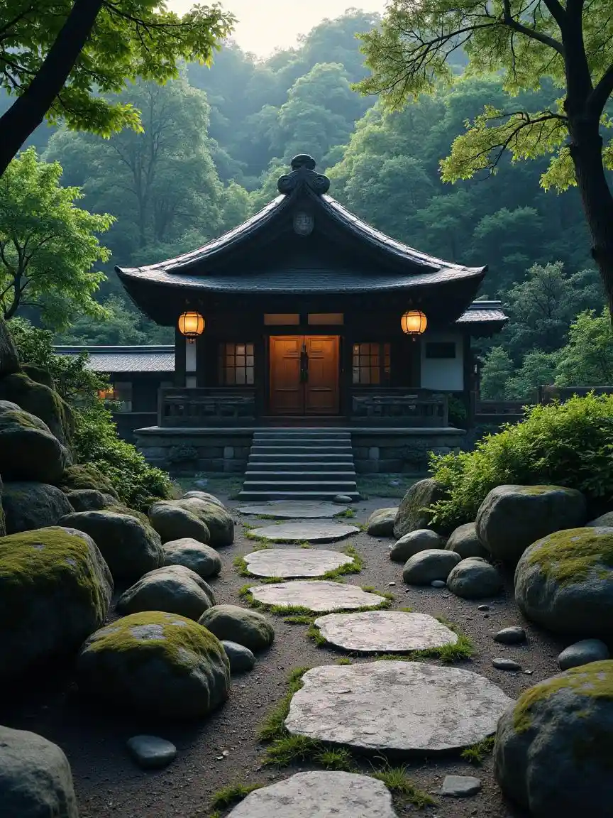 Le soir, dans le jardin d'un ancien temple entouré de pierres et d'arbres, un chemin de pierre mène à la porte d'une vieille maison avec des lanternes accrochées dessus. Le tableau dépeint l'atmosphère d'une architecture japonaise. Devant vous, vous pouvez voir un terrain vague où les pierres ont été soigneusement disposées. Des mousses vertes poussent autour d'elles. Cet endroit semble être un autre monde. On a l'impression que le temps est venu dans un cycle complet, ce qui nous fait nous sentir seuls, calmes et paisibles ici.