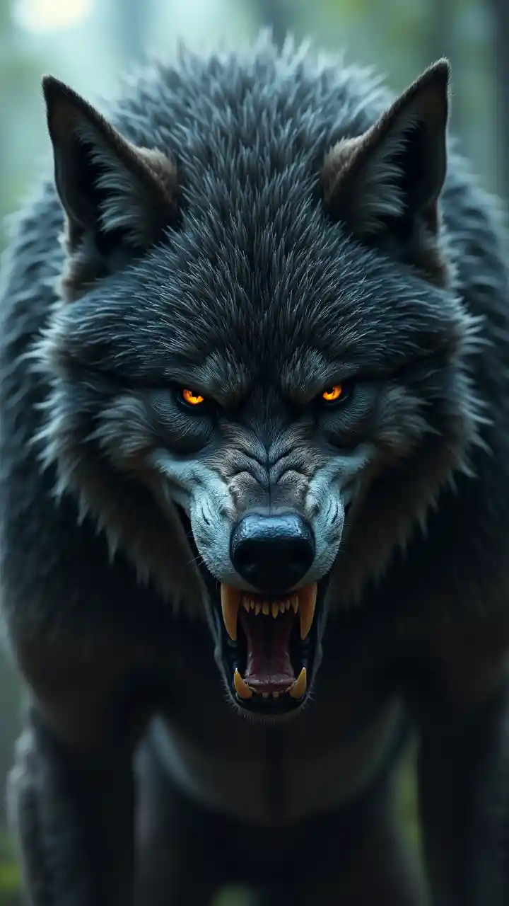 Portrait ultra-détaillé d'un loup-garou terrifiant aux crocs complexes intimidants et aux yeux effrayants et vifs, sa longue fourrure est capturée sous les lumières du film et du volume. La composition est épique, avec un équilibre impeccable, le réalisme s'affiche avec un beau flou bokeche. La conception des personnages est rendue avec une technologie de pointe similaire à celle du moteur Unreal et du rendu Octane, avec un effet HDR et une diffusion de sous-surface pour le réalisme. Le style de prise de vue est l'appareil photo numérique Hasselblad H4D 200MS avec l'objectif Mitakon Speedmaster 65mm f/1.4 XCD. Le portrait utilise l'éclairage de Fresnel pour améliorer la texture et la profondeur. L'expression féroce et la posture dynamique du loup-garou créent un sentiment de crainte et de peur. L'arrière-plan est un arrière-plan vague qui met en évidence sa menace.
