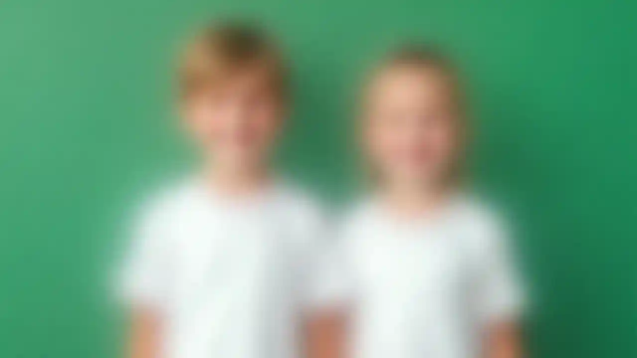 Petits garçons et petites filles en tee-shirts blancs, debout devant un fond vert, chemise blanche sans imprimés, des tout-petits souriants de 3 ans, photographiés pour des modèles de costumes