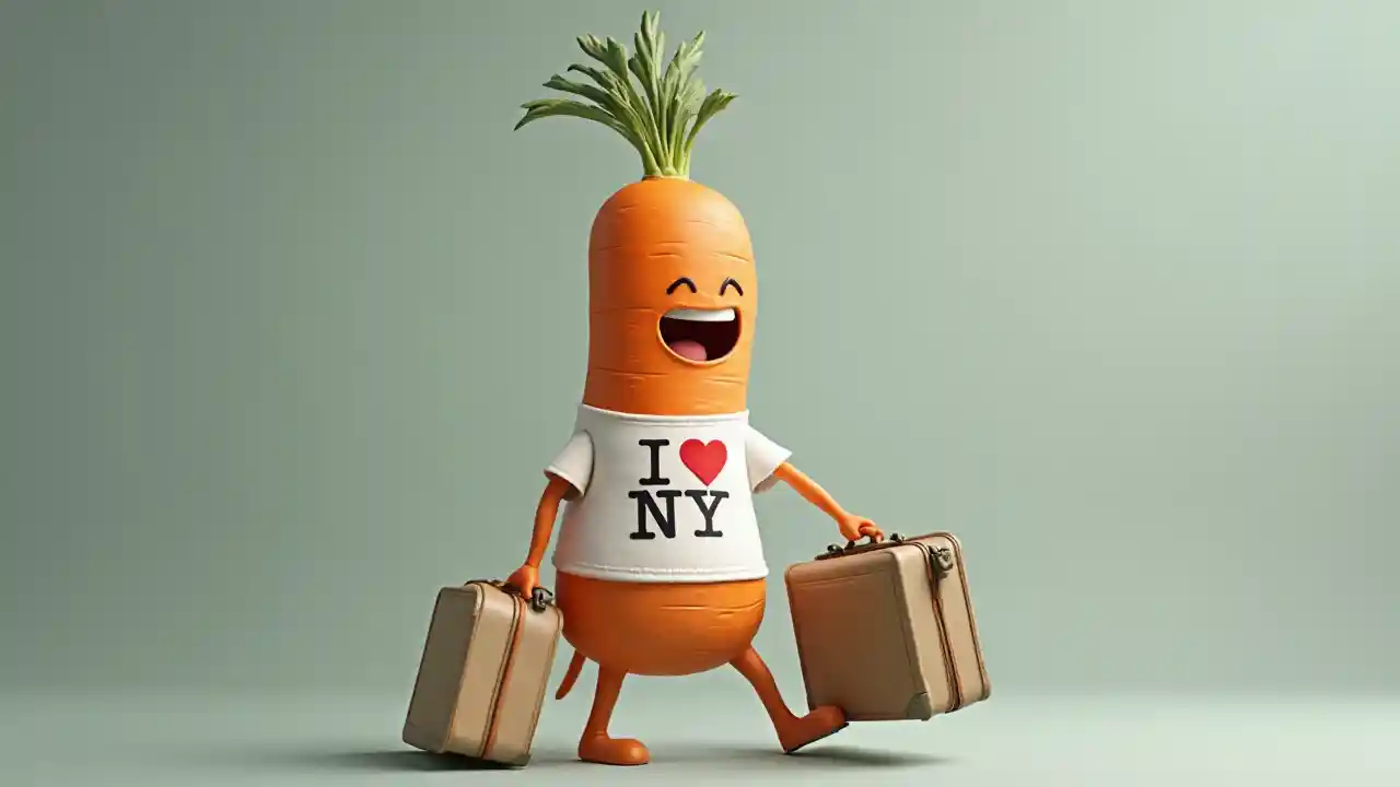 Un personnage de carotte de voyage anthropomorphe sourit, porte une valise et porte une chemise blanche « I love New York »