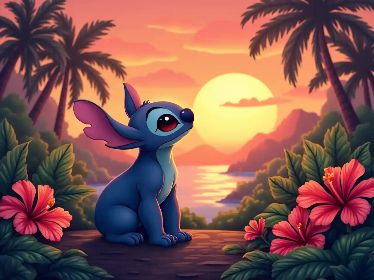 Stitch est assis dans un paysage tropical au coucher du soleil avec des fleurs d'hibiscus.