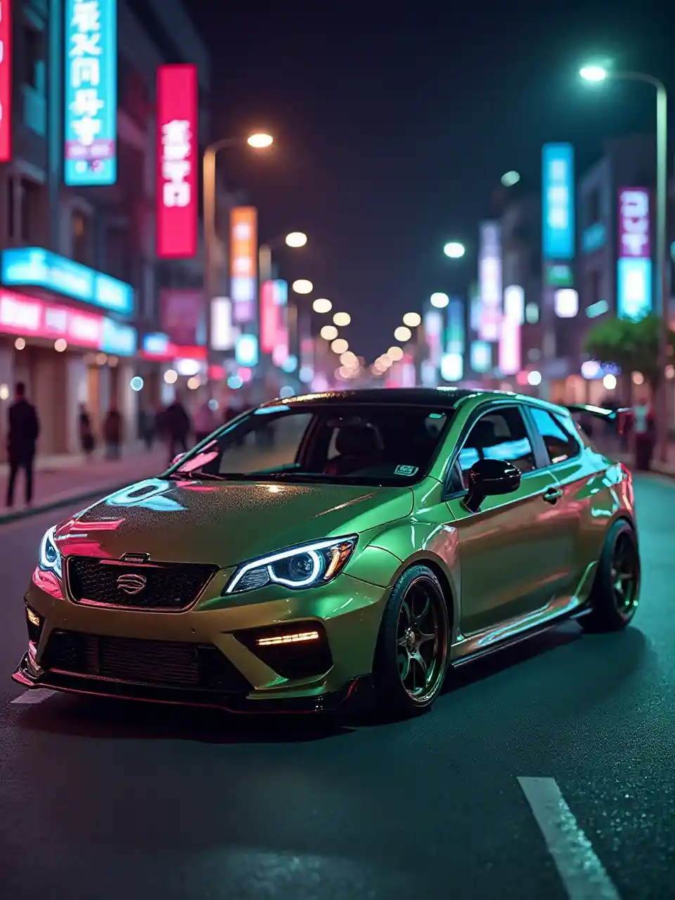 Véhicule tunnel compact sport vert kaki, fond lumineux néon Tokyo
