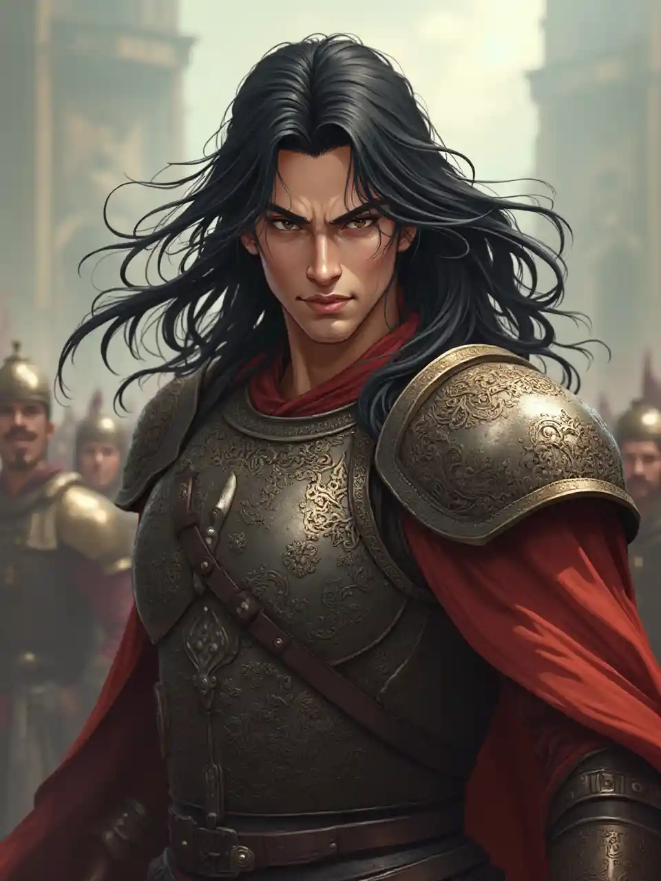 Anime, samouraï turc, expression incroyable et confiante, position debout féroce, armure détaillée parsemée de motifs complexes, cheveux noirs flottants, texture et muscles réalistes, détails riches, couleurs vives, couleur de fond dramatique, audacieux La lumière forte et l'atmosphère représentent un ancien champ de bataille, une atmosphère épique, un rendu ultra-détaillé et une qualité cinématographique.