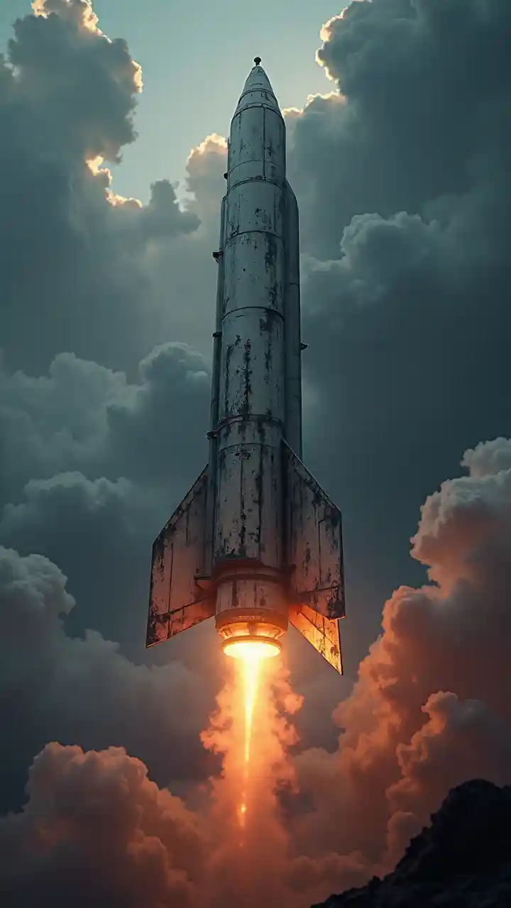 Une représentation super-réaliste d'un missile en mouvement, entouré de lumières fortes et dramatiques, rappelant aux gens des films et des films, avec une texture altérée à la surface. Photographiée en bas angle pour souligner sa forme puissante, l'image est populaire sur artStation et affiche une définition ultra-haute définition de 8k. La scène est ultra-réaliste, avec une mise au point claire et des détails extrêmes comme si elle était rendue dans Unreal Engine 5. L'œuvre d'art est un chef-d'œuvre, combinant les éléments fantasque de l'atelier Ghibli avec les coups de pinceau complexes de John William Turner pour produire une œuvre visuellement étonnante et complexe.