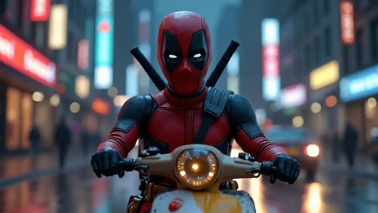 Deadpool chevauchant un scooter licorne dans une ville pluvieuse