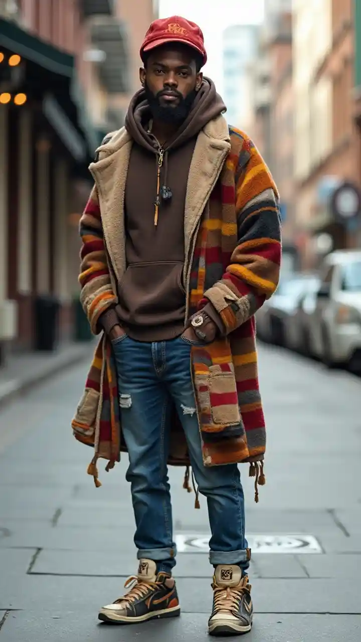 Un jeune homme élancé, barbu et à la peau foncée, coiffé d'une vibrante casquette POKAS Sepik, épuré élégamment d'une confortable veste de couverture, accompagné d'un jean coupé tendance et de chaussures KT accrocheuses. Ambiance streetwear décontractée et unique, montrant l'individualité dans le contexte de la ville, avec des caractéristiques exceptionnelles d'éclairage naturel doux, une image super méticuleuse et de haute qualité.
