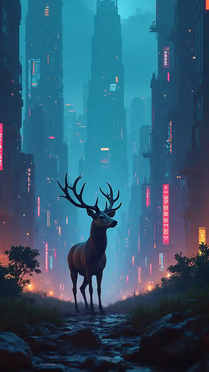 **Conseils: ** « La représentation visuelle détaillée de la création d'un paysage urbain futuriste nocturne se caractérise par des gratte-ciel imposants au néon, des voitures volantes animées et une riche esthétique cyberpunk. Au premier plan, la caractéristique remarquable est un cerf, symbolisant les effets de la déforestation. Le cerf doit véhiculer un sentiment de perte et d'exode causé par la destruction des forêts par le développement urbain. Entouré de cerfs avec des éléments visuels qui soulignent le contraste entre la nature et la technologie, tels que des arbres qui luttent pour survivre dans des environnements de béton et de néon ou pleins de verdure. Tout en montrant la réalité dynamique mais dure de la future ville, la scène devrait éveiller la nostalgie et le souci des gens pour l'environnement. "